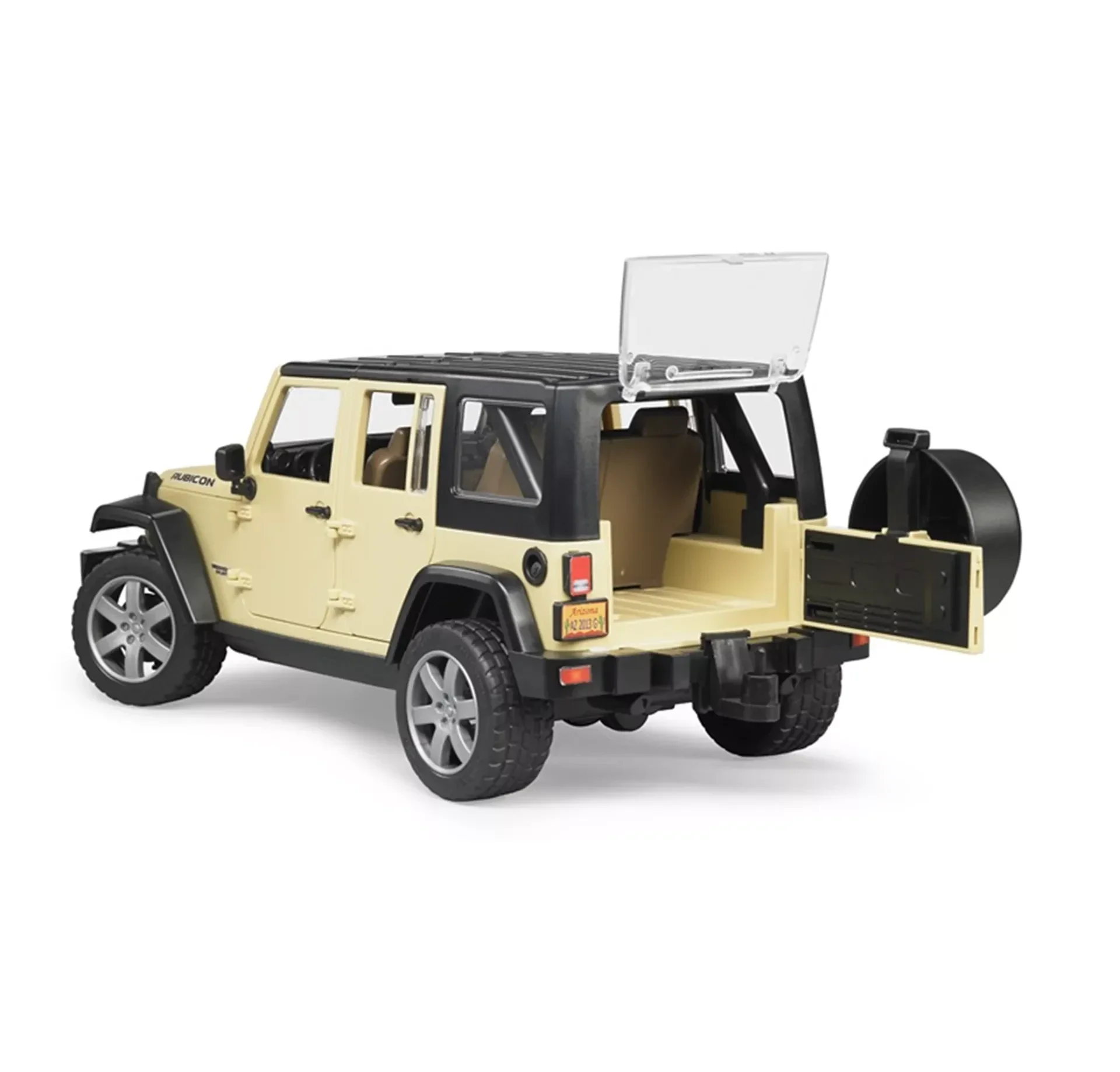 De Jeep Wrangler Unlimited Rubicon is niet alleen optisch een aantrekkelijk terreinwagen, maar heeft ook talrijke functies, die bijna grenzeloze speelplezier mogelijk maken. Naast de 2-delig afneembaar segmentdak, kunnen ook de motorkap, de laaddeur en alle vier deuren worden geopend. Uiteraard zijn de ruimte zo, dat ook vier Bruder bworld-figuren in het voertuig passen. Als alternatief voor de volledig gast is de achterbank uitneembaar, om dan in de het bereik met de BRUDER-norm verbinders accessoires op te kunnen nemen. De extra stuurkolom dient voor het eenvoudig sturen via een dakluik en kan bij niet-gebruik in de vloer worden opgeborgen. De assen zijn terreinwagen gebruikelijk geveerd en de geprofileerde wielen hebben velgen in een aantrekkelijke SUV-look.